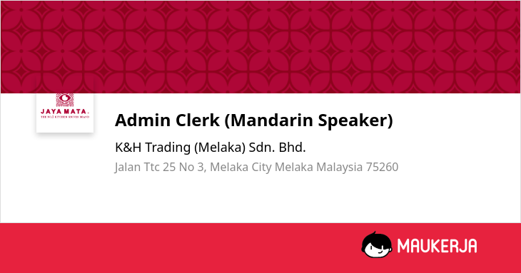 Kerja Sepenuh Masa Admin Clerk (Mandarin Speaker), Gaji tinggi MYR 1,700 di K&H Trading (Melaka) Sdn. Bhd. Melaka - Maukerja