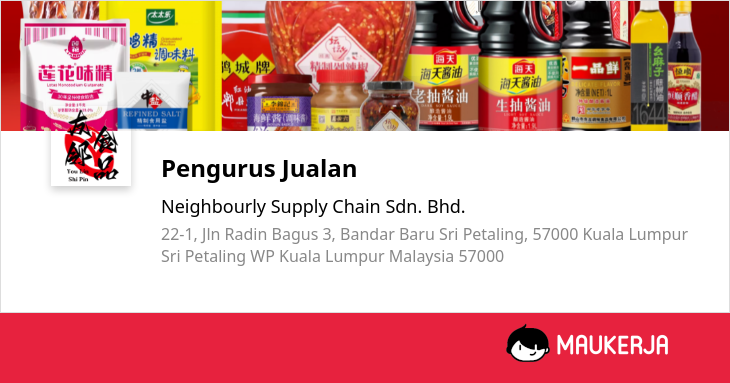 Bertanggungjawab untuk kerja-kerja jualan produk jenama makanan China yang diwakili syarikat di kawasan Kuala Lumpur dan Selangor.